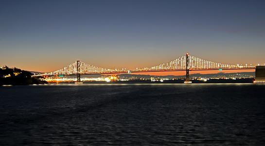 We’ve spent the last two days steaming up the coast of northern Mexico and California, it’s been very relaxing, but the weather has become very cool and overcast. This next stop in San Francisco is a home coming for us, we live about an hour north, and with the ship overnighting here we plan to spend the first day at home and the second acting as tour guides for our friends Christine and Ray. At about 5:30AM this morning the Queen Victoria sailed under the Golden Gate Bridge and entered San Francisco Bay; we’ve done it before, but somehow it felt extra special today – perhaps because this the longest we’ve cruised so far? The iconic red bridge appeared in the distance, illuminating our way; it seemed take an age to finally reach the structure and then woosh we were under and on our way to the dock. The sun had still not risen by the time we docked at pier 27, the “new” cruise terminal in San Francisco. From our balcony we watched the docking procedure and had a great view of the Golden Gate Bridge, the Bay Bridge, Coit Tower and another cruise ship docked at the “old” cruise terminal. Finally the sun came up and the view was further enhanced, including a stunning image of the moon setting right over the Golden Gate. We opted for early bird disembarkation and after a short wait in the theater we were escorted down to the immigration desks in the terminal where we had no problems with our documentation and found ourselves outside the terminal by about 8:30AM. Our daughter Laura had spent the night in San Francisco and promptly picked us up and we were on our way home for haircuts, laundry, shopping and taxes.