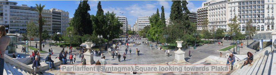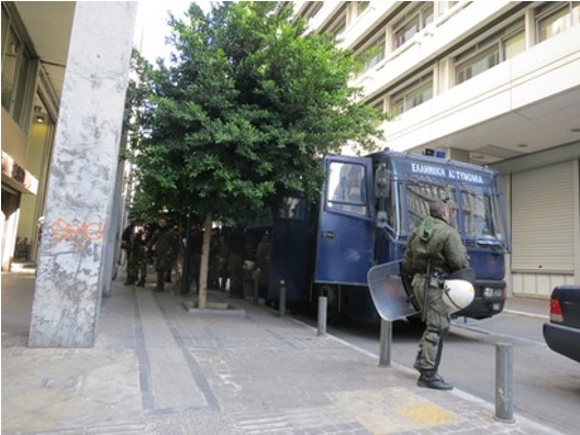 We wandered through the streets and made our way up to Parliament Square, site of the previous days “funny walks” incident. On the way to the square, we noticed crowds gathering and then came across a couple of large vans disgorging several squads of riot police. Greece is in a fairly dire state of political and economic unrest with high debt and unemployment – and the people were venting their frustration with a rally. It turned out to be all very friendly with the two opposing sides taking turns to express their opinions via bullhorns in front of the parliament building. The democratic process at work, in the birthplace of democracy.