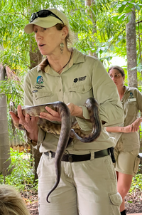 We’ve had three sea days since leaving Cairns last Sunday and during that time we’ve rounded the very top of Australia and turned west for Darwin. We attended a couple of lectures by Sir Peter Cosgrove, the former Governor General of Australia – a position that is the Queen’s representative in the country. Sir Peter is from Australia and after a successful career in the Army he was selected as Governor General – he had many great stories to tell and was a very good speaker. Yesterday the ship diverted south to enable a coast guard helicopter to airlift a sick passenger – it was quite dramatic and the third such event for us on this trip. The weather has turned very warm and very humid; 87F, 85% and this makes for very uncomfortable exploring a shore. Today we took a ship’s tour to the Northern Territories Wildlife Park, about a 45-minute coach ride south of Darwin. The locals refer to this are as “The Top End” and the port of Darwin sits in a gigantic natural harbor offering excellent sheltered anchorage for ships. Darwin seems to exist to support the import and export of goods to and from Asian countries further to the north. During World War two Darwin was quite heavily bombed by the Japanese in attempt to break the supply chain for American and Allied forces. We passed the entrance to several tunnels that were created during the war to store precious bunker oil and now serve as tourist attractions. The town has a quite modern center with nice roads and several high-rise buildings. The Northern Territories Wildlife Park is a government run facility set up to preserve the native animals and educate the public – kind of like an open-plan zoo. From the main building, several open sided buses (though they refer to them as trains) run on regular schedules around the paved roads that wind their way through the park. The trains stop at the major attractions and passengers can decide to get off and explore the area and then wait for the next train to come along. We viewed the nocturnal facility (inside, dark but airconditioned), the water buffaloes and the wild bird area. The nocturnal rooms were a bit disappointing as all of the animals were behind glass and often the glass was steamed up or dirty. The water buffaloes were very tame and, at the rattle of carrots in a metal bucket, came over the fence to be hand fed – it was a bit staged and not what we really expected. The bird display, although again a bit of theater, was very well done. Amongst others, we saw a barn owl, osprey, emu, parrots, and an amazing bird of prey that picked up a rock in its beak to crack open a large egg. By this time we were about to pass out from the heat and humidity, both of us were soaked in sweat and could hardly see for the sweat dripping down our faces. Of course we’d forgotten to buy some water at the main building before we boarded the train – a cardinal sin in the tropics. So we decided to head back to pick up some water before continuing our exploration. We walked back up to the road and joined about 6 other visitors to wait for the next train to come along. There was a little bit of shade and a couple of bench seats, but no breeze – and so we began to slowly dehydrate as we waited and waited. Finally after about 35 minutes the train came along, l must have looked like a big prune by the time I boarded. Back at the main building there was a small airconditioned café and gift shop. We quickly drained a bottle of water each and selected an ice cream bar from the huge selection in the freezer – this combination seemed to bring us back from the brink. By now there was no time to go back out into the park before our coach left for Darwin, again a bit disappointing. We’d expected to see Kangaroos and Koalas, but the park had neither, in fact we learned that the former doesn’t do well in tropical climates – they mostly populate the interior of the country (when we booked this trip many months ago, I could have sworn the information said we’d see kangaroos). We did see a wallaby, basically a small sized kangaroo, in the nocturnal facility, and we would have seen then out and about if we’d had more time. Just before leaving, a couple of the employees brought out a black headed python, a big lizard, and a baby wallaby – and visitors could get close for pictures. The coach dropped is Darwin to do a bit of shopping as we had a couple of hours before the ship would depart. The shopping center of Darwin reminded me of the UK in the 1960’s; there was one central main street that had been pedestrianized, and the shops on either side had overhanging permanent awning-type structures to provide a bit of shade or protection from the rain. By the way, they measure their annual rainfall in Metres in this part of the world – receiving between 1.5 and 2M per year on average. The central shopping area was not covered and therefore not airconditioned, however all of the shops were cooled and so we’d periodically pop into a shop to cool off. We wandered a bit, had a coffee, and then took the shuttle bus back to the ship. Later that night we attended a six course “Chef’s Tasting Menu” dinner in the alternative dining area of the ship – offered at a $25 per person additional charge. Unfortunately most of the courses were not to our liking; from under cooked lobster to oily barramundi and fillet of beef that was on the rare side and smothered in a mushroom sauce (we don’t like mushrooms) – we were not impressed. The table-side prepared Crepe Suzette, with dramatic leaping flames was passable though I thought it had too much orange rind. Even though Sandra and I were disappointed our 4 table mates all raved about the meal.