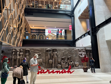 Yesterday we sailed between the islands of Borneo in the north and Java in the south, heading mostly west. The weather was getting hotter, and seas were calm and dotted with many small fishing boats – the captain told us that Indonesia has over 500,000 fishing vessels. This morning Queen Victoria docked in the large commercial port of Tanjung Priok; we called our daughter Laura on Facetime and showed her the view from our balcony – she asked if we were in Oakland, the large commercial port in the San Francisco Bay. The skies were overcast and, as we headed down for our morning coffee, there was a real threat of rain. From the Chart Room windows we could see the welcoming committee forming up on the dock; a troupe of dancing locals in traditional garb accompanied by a substantial Balinese band – the music started up and the dancing began – all this before breakfast! We were trying to keep an open mind about our visit to Jakarta, the capital of Indonesia on the island of Java (at least until 2025 when it will move to a city on the island of Borneo) – what we had heard and read was mostly negative, with crime and the lack of attractions dominating. So it was with some trepidation that in the pouring rain, we dashed from the ship to the terminal, stopped for a quick photo with the reception committee, and boarded our coach for the excursion. The guide was not so good, his English was very broken and, as with most of the guides, he seemed to feel the need to talk incessantly – the volume of the sound system was extremely loud. At first, I turned down the volume on my hearing devices, then I removed them, then I inserted rolled up tissue into my ears – I’d had enough, I got up and made hand signals to the guide, pointing at my ears, pointing down, and mimicked turning down a volume control. He smiled, kept on talking and completely ignored me! From the port to the city was about 15km but it took about an hour to reach our first destination; Jakarta is a massive, sprawling city with a huge traffic problem. The traffic situation is made worse by a large construction project that is ongoing and will result in a brand-new rapid transit system in a few years. The Dutch came to Java in 1619 and founded the colony of Batavia, the present-day Jakarta. The lure of spices from the east drove the Dutch East India Company to make Batavia the capital of their Asian operations; at that time some of the spices were more valuable than gold. The Dutch built infrastructure to support their business: canals, warehouses, government buildings and roads. Much of the Dutch influence can still be seen, we crossed several canals – now mostly disused, and arrived in the area now known as Old Batavia. Exiting the bus we took a short walk to Fatahillah Square; the square was very large and lined with many old colonial buildings. We took cover under an overhang as the heavens opened and there was a torrential downpour. The storm lasted only a few minutes and as it eased off, we could see groups of school children beginning to emerge into the square. The Puppet or Wayang Museum faces the square and is housed in a building that dates to 1912, the museum was established in 1968. Wayang is a form of traditional puppetry that originated in Indonesia; the puppets are held on sticks and often projected onto a screen – the shows occur at rituals but also for tourists. The museum was on two levels and the arrangement of the items was a bit haphazard; nevertheless some of the puppets were very impressive and it’s easy to see how these puppet shows are an important part of the national culture. By the time we came out of the museum the rain had stopped and the sun was out, the square had also been filled with dozens of groups of school kids of junior high and high school age. Each group had their own matching outfits and they gathered for group pictures and to perform the school chant. Sandra was keen to get a photo with a group of girls and, as she approached their teacher to ask permission, she was if the girls could take a picture with her – much giggling and posing ensued, with the teacher encouraging the girls to talk to us in English. A few minutes later we were approached by a group of boys and asked to pose with them – it was great fun and so uplifting to see the enthusiasm and energy level of these young kids. The Indonesian national monument and the presidential palace are located in the center of Jakarta; the area known as Medaka Square has wide roads, large buildings, and statues – it feels very much like a national capital. We glimpsed the palace, a low white building across a busy road and walked over to the national monument, an impressive 433ft tall obelisk placed on a base to represent a pestle and mortar. The monument was completed in 1975 and includes an observation deck at the top of the tower, but our tour did not include access to the deck. A short drive from Medaka Square brought us to the National Museum of Indonesia for a one hour stop; the museum is huge, and it would really take a couple of days to do it justice. The guide tried to insist that we follow him around in a group, but we ignored him and set off on our own. Wow, the collection is massive and really well displayed – from ancient to recent history the artifacts are thoughtfully arranged, and we wandered around gawping at fabrics, clothing, pottery, statues, boats, and many other amazing things. Soon we realized that we had only visited the original older building as we crossed an adjoining lobby to see another immense newer building. Time was up and we had to return to the bus. The final stop for this trip was at the Sarinah department store for an hour of shopping and lunch. Everyone in our group headed for the many stores located within the building on many levels, but we spotted a restaurant that seemed to very popular with the locals. Dewata Restaurant was a great choice, we were indeed the only non-Indonesians in