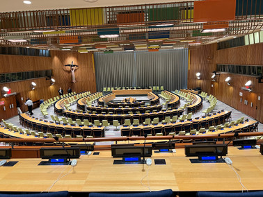 The guard at the tourist entrance to the UN directed us across the street to the security office; we noticed an enormous line of people snaking its way along the street and around the building – we couldn’t believe this was the line for the tour group we had been assigned to. It turns out the line was not for our group – it was a special group who were attended a UN council meeting for people of African descent, the majority of the attendees were in traditional African garments – I suppose this should have indicated they were not in our group. The African line was completely obscuring the little tourist security office and when we finally fought our way through there were only about half a dozen people in the line. Note it is necessary to arrive an hour before your tour time this is to allow for the ID checking and badge issuing.